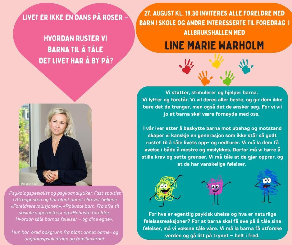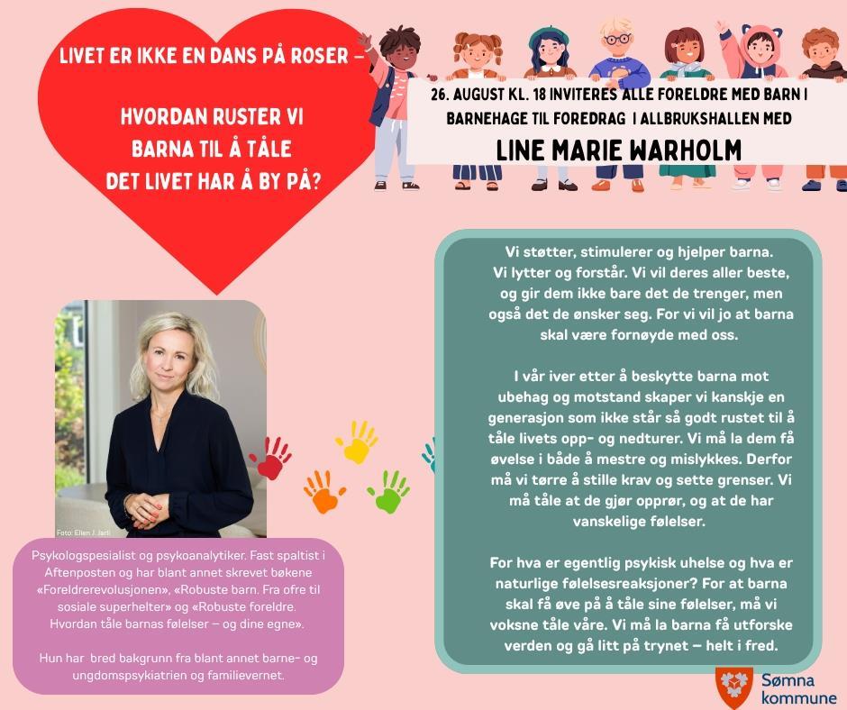 Alle ansatte i Sømna kommune og interkommunale tjenester som jobber med barn og unge er invitert til egne foredrag og så inviterer vi alle barnehageforeldre den 26. august og skoleforeldre og andre interesserte 27. august. Vi håper å se deg der!