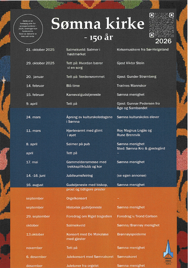 Sømna kirke - 150 årDette er en foreløpig plan for arrangementene i jubileumsåret 2026. Sist endret 30.03.2026 13.07
